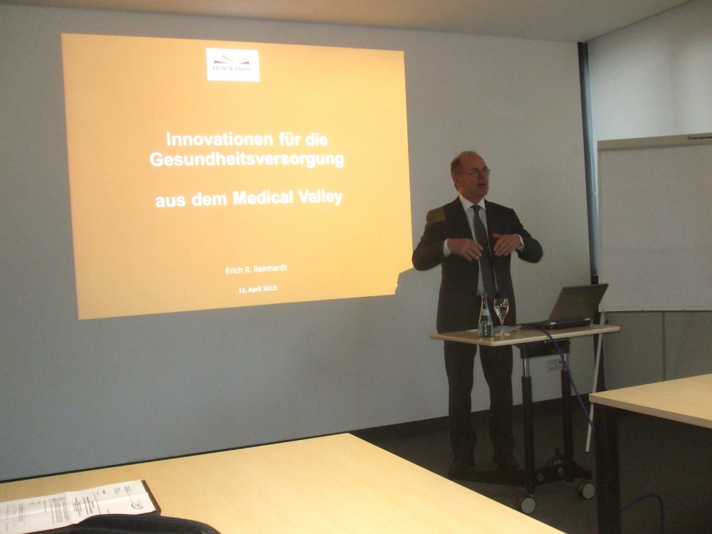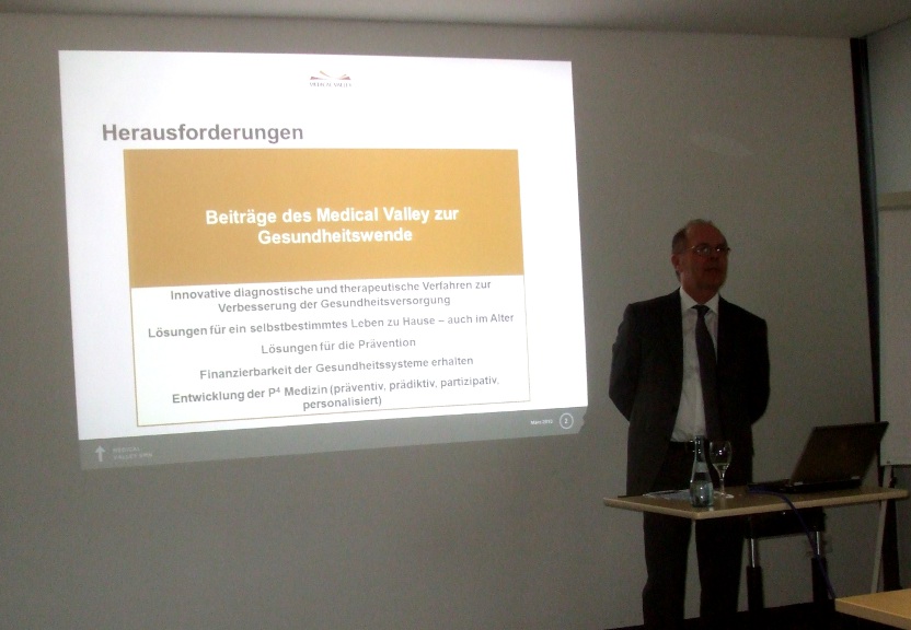 Am 12. April 2013 feierte das Medical Valley Center (vormals IZMP) sein 10 jähriges Jubiläum. Im Rahmen des Mittelstandstreffs der MU Erlangen referierte am 11.04.2013 Professor Dr. Erich Reinhardt über das Thema "Das Medical Valley - Chancen für den Mittelstand" Das Medical Valley der Metropolregion mit dem Medical Valley Center in Erlangen schreibt schon jetzt eine einmalige Erfolgsgeschichte. Von Herrn Prof. Dr. Reinhardt erfuhren die Teilnehmer des Mittelstandstreffs in einem überaus interessanten Vortrag Neues über Innovationen für die Gesundheitsversorgung aus dem Medical Valley, was die Erfolgsfaktoren im Cluster sind und welche Möglichkeiten im Gesundheitsbereich zur effektiven Verbesserung gegeben sind. Besonders für den Mittelstand erschließen sich große Chancen für ein innovatives, gesundes Wachstum. Impressionen Vergrößerung: auf