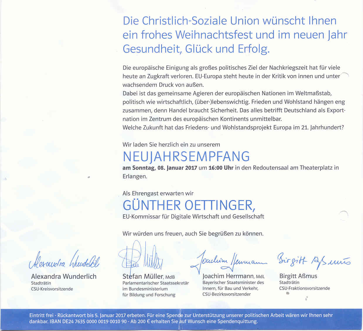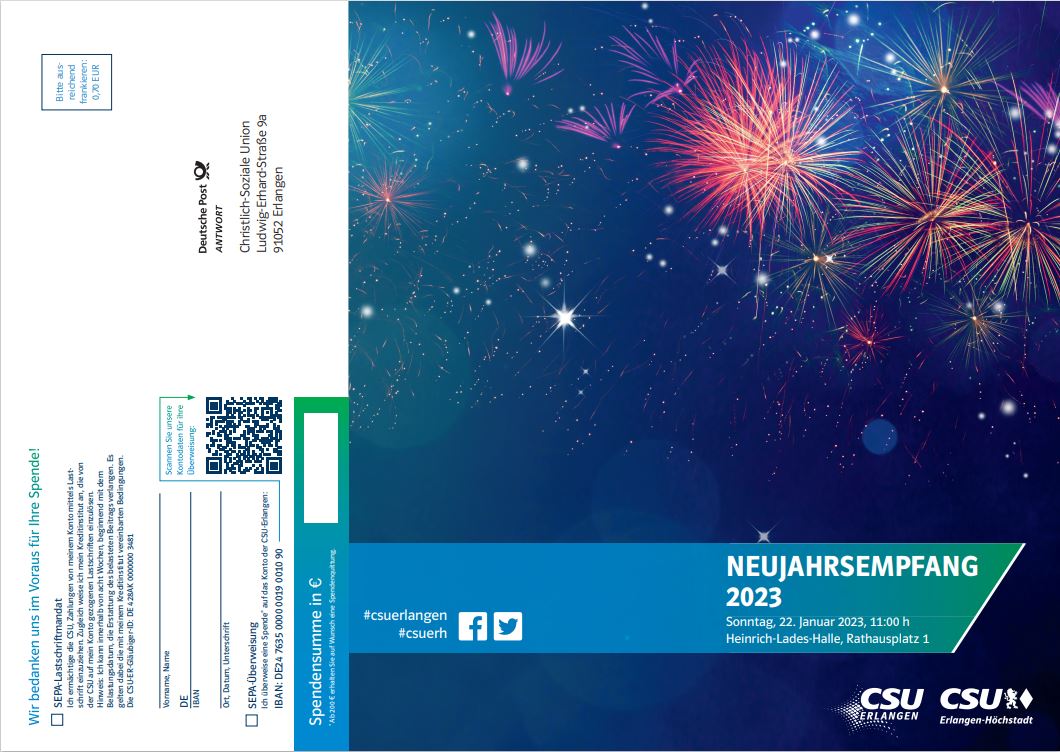 Impressionen vom Neujahrsempfang (22.01.2033-11:00 Uhr) der CSU in Erlangen Zum traditionelle Neujahrsempfang der CSU in Erlangen, mit Ehrengast Ulrike Scharf, Mdl. Staatsministerin für Arbeit und Soziales hat die CSU Erlangen und die CSU Erlangen-Höchstadt gemeinsam in die Heinrich-Lades-Halle Erlangen eingeladen. zum Vergrößern auf Miniaturansicht klicken