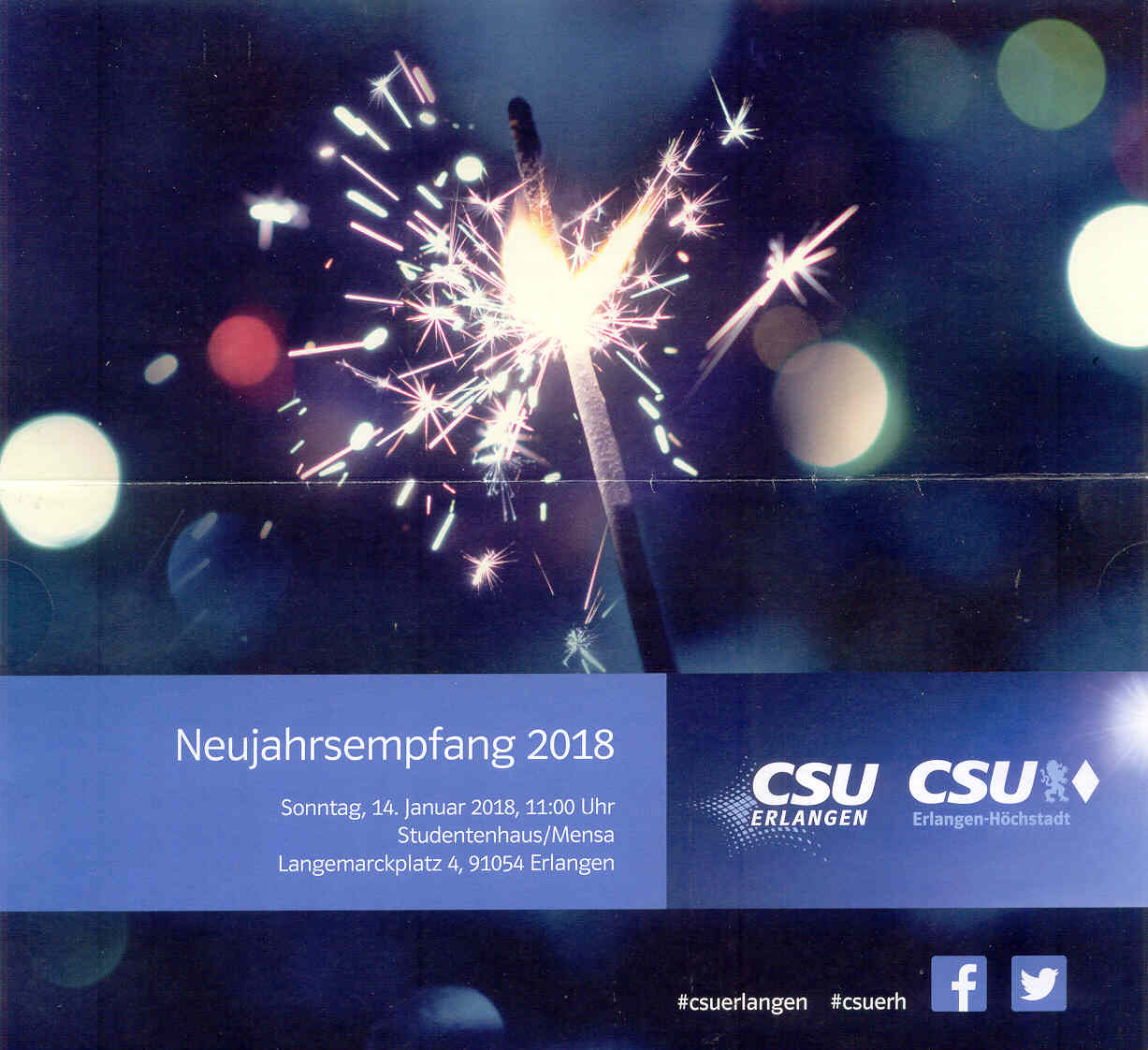 Impressionen vom Neujahrsempfang (14.01.2018 -11:00 Uhr) der CSU in Erlangen Zum traditionelle Neujahrsempfang der CSU in Erlangen, mit Ehrengast Volker Bouffier MdL, Hessischer Ministerpräsident und stv. Vorsitzender der CDU hat diesmal die CSU Erlangen und die CSU Erlangen-Höchstadt gemeinsam in die Mensa des Studentenhauses Erlangen eingeladen. zum Vergrößern auf Miniaturansicht klicken