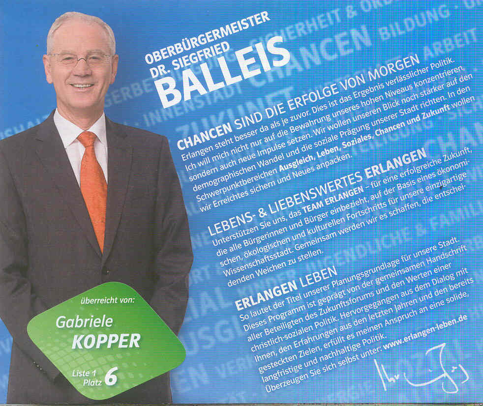 -Kandidat Stichwahl 30.03.2014 "Erfolgreich aus Tradition" Es freut die Mittelstandsunion Erlangen, dass Dr. Siegfried Balleis sich auch für 2014 - 2020 mit Herz und Verstand als OB für die Stadt Erlangen einsetzen will. Die Bürgerinnen und Bürger der Stadt Erlangen haben damit wieder den besten und erfolgreichsten OB Kandidaten. Der Mittelstand wird auch in Zukunft vom erfahrenen Dr. Siegfried Balleis profitieren.